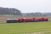 Former SBB locomotives on the way to Etzwilen. Re 4/4 I # 10039, built in 1946, privately owned and used by TR TransRail, pulls the diesellocomotives Bm 6/6 # 18511 (operational), 18508 and 18510 ... (more)