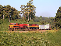 In the bright, early morning sun, KCS 4001 leads daily intermodal train 24E just west of Leeds, Alabama at the area known on the railroad as "Henry Ellen".