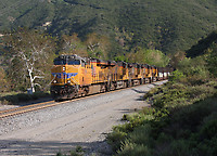 A westbound UP loaded ore train eases down Cajon Pass between Blue Cut and Keenbrook.