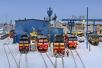 Diesel locomotives TEP70 in the locomotive depot Kotlas Yuzhny. Kotlas is a town in Arkhangelsk Oblast, located at the confluence of the Northern Dvina and Vychegda Rivers. During the 1930s, Kotla... (more)
