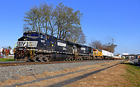 Westbound at seventh St on the Lurgan Branch with The NS Veterans engine fresh out of the shop at Altoona , Pa. on its maiden trip. With RDG Heritage engine trailing.