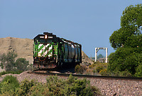 A BNSF local freight, led by Burlington Northern EMD GP15-1 No. 1390. is about to roll through a curve after crossing the bridge over the Shoshone River at Lovell, Wyoming, on September 2, 1998. B... (more)