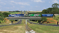 Southbound train Y54 led by AC44i #2513 departing Matão yard, photographed over highway SP364