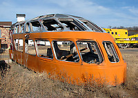 The shell of a Milwaukee Road Hiawatha tail car grows older in the weeds at a small railroad park in western Minnesota.