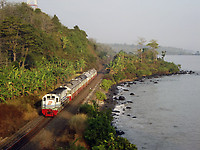 A freight train skirts the Java sea shoreline which provides some scenic views.