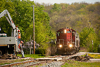 Canadian Pacific Nitrin Job led by GP 105/103 southbound from Cordova, IL pass MOW crews at Rapids city enroute to Nahant Yard south of Davenport, IA
