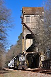 Nearing the end of the line at Senoia, NS's G66 local is dwarfed by the massive Central of Georgia RR coaling tower where the line to Columbus split from the line to Griffin.