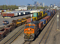A warbonnet dash 9 heads up a unit grain train through St. Paul under the signal bridge at Hoffman. This train originated at Finley, ND and is heading east to Greenwood, IL.