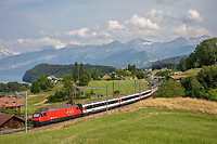 Highspeed tilting train ETR 610 # 002 of Trenitalia is running the EC 57 from Basel via Berne-Lötschberg-Simplon to Milan, along the Lake Thun between Gwatt and Spiez.