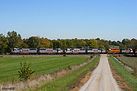 Three Southern Belle liveried units run KCS Train G-BVKC-06 northbound at 289th Street on the KCS Pittsburg Sub. in the late afternoon light. Thankfully there was a stiff south wind, or otherwise... (more)