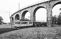 Third and second class railcar BCe 4/4 # 4 of the Bernina Bahn is running through the Brusio spiral viaduct some decades ago, pulling a covered and a gondola freight car. This is a commemorative p... (more)