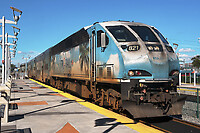 A heavily faded BL36PH locomotive leading a southbound Tri-Rail commuter train departs its Deerfield Beach station stop on a beautiful Florida autumn afternoon.