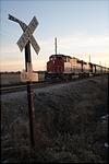 A TPW job gets ready to head west away from the rising sun after switching the grain elevator on the west side of town. Note the TP&W written on the crossbuck post.