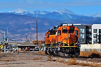The Rocky Mountains have fresh snow on the peaks as BNSF 2604 (GP39-3) pulls a short freight towards Lafeyette, Colorado.