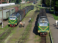 Last functional 750mm narow gauge locomotive of Borzava Railroad (part of Ukrainian Railway, Lviv region) turning around two cars train in Chmilnyk station for ride back to Vynohradiv. Station is ... (more)