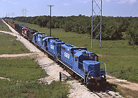 Rock hauler Georgetown RR has also gotten into ballast distribution. Its continuous-belt ballast train with two Paducah rebuilds, GRR 9050 East was on the U.P., former MoPac, at Hestes, Texas (be... (more)