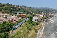 Passenger train from Messina to Catania is captured as it leaves Letojanni, a popular holiday resort.