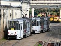 Tram depot 'Wrzeszcz' in Gdansk. Konstal 105Na tram rolls out from parking tracks and sets off on his route.