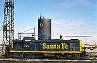 Santa Fe 2130, in from La Junta, idles at the Pueblo engine terminal. By December, 1964, Santa Fe’s 53 Alco RSD5s are running out their final miles in Colorado and New Mexico freight service, as... (more)