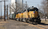 A pair of Union Pacific SD40-2s drops off a cut of grain cars at the Lodgepole elevator.