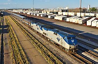 The California Zephyr runs past the BNSF intermodal facility in Denver, Colorado.