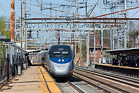 A northbound Acela Express roars though the Trenton Transit Center en route to Newark, NJ.