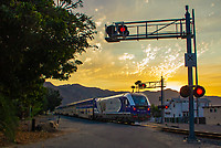 Amtrak California Pacific Surfliner No. 768, the morning southbound to Los Angeles from Santa Barbara, hits the crossing at Faria at Sunrise.
