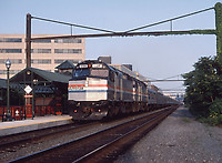 Amtrakās Chicago, Illinois, locomotive facility hosts Grand Trunk Western EMD GP40-2 No. 6413 amongst the usual plethora of Amtrak EMD F40PH locomotives on September 1, 1991.