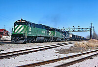 Leaving the Orin Line and heading east on the Black Hills Subdivision, an eastbound Burlington Northern coal train led by GE C30-7 No. 5109 snakes through Donkey Creek Junction east of Gillette, W... (more)
