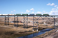 An eastbound with five units crosses the Cut Bank, MT trestle on Burlington Northern's HiLine.