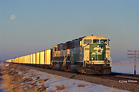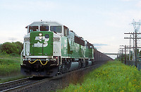 After meeting an eastbound Burlington Northern coal load at Sully Springs, North Dakota, a westbound departs the siding on the afternoon of August 9, 1991. The empties are powered by three fresh S... (more)