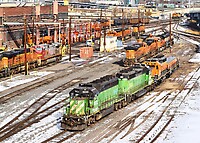 One of the last remaining BN painted motors in the Denver area spots loaded autoracks at Big Lift for unloading on the Colorado Joint Line, with the Front Range of the Rockies looming.