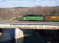 BN GP39E #2759, a BNSF B23-7, and another BN GP39E lead an eastbound manifest over the Vermillion River in Streator.