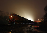 Eastbound BNSF train is about the head under the pedestrian bridge at Kansas City Union Station.
