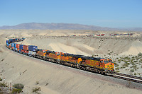 BNSF C44-9W 4975 leads a long, heavy LA-Chicago stack train east on the Seligman Sub. They're about to cross into Arizona at Topock.