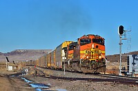 BNSF 5340 (Dash9) leads an autorack train past the signal at Spruce, Colorado as it runs south on the Joint Line.