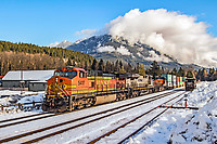 There was still plenty of snow as this westbound stack train continues west through the town of Skykomish.