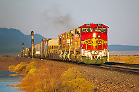 With a very presentable ex-Santa Fe Dash 8 on the point, BNSF's Boron Local departs the US Borax mine at Boron after completing the day's work in the desert. The train is approaching Highway 58 as... (more)