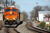 3 ES44AC units power this 2x1 coal train as it eases thru downtown Chariton at 30mph eastbound. This a coal train from Antelope Mine, WY to Machens, MO for Union Electric.