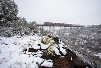 In late Jan snow falls all the way down to Drake, AZ as the 7250 leads the Phoenix/westbound train over Big Hell Canyon on the BNSF Phoenix Sub.