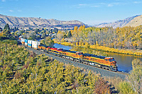 A BNSF Z-train rolls east along the Wenatchee River in fall color, supported by a colorful consist. In about 15 minutes the train will be stopped in Wenatchee for a quick crew change before headin... (more)