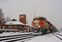 It's the 3rd day of spring, and huge wet snowflakes are falling in the Kansas City area as BNSF Train M LINTUL1 23A blasts south past the depot in Lenexa.