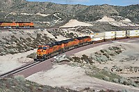 A military train heads upgrade into Santa Susana pass with a couple BNSF visitors in charge.