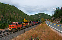 A BNSF trackage rights train drops out of the Front Range at MP 22.6 on Union Pacific's Moffat Tunnel Sub. The hind end DPUs, visible on the distant hillside, are no doubt providing some dynamic ... (more)