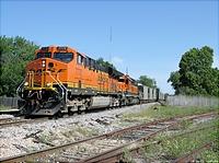 A duo of BNSF GEs cruises westward through Campbellstown toward the Indiana border on NS's New Castle Subdivision, fronting a vehicle train.