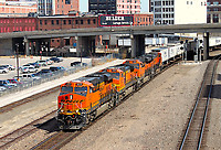 A crude oil train snakes its way into BNSF's Northtown Yard, while the BNSF track geometry train readies for departure and carman work an inbound train.