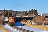 A pair of ACe DPU's shove a loaded BNSF coal over the Santa Fe Bridge in Larkspur, Colorado.