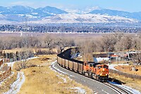 BNSF Ace 8403 leads a coal train through the S curve at Spruce, Colorado.