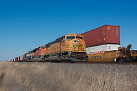 BNSF 9929 west meets an eastbound double stack near Fiona, Texas.