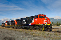 Still looking pretty fresh, CN ES44ACs 2951 and 2969 idle on Jasper's shop track.